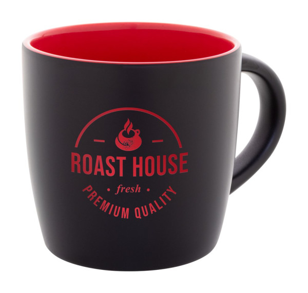 Mug en céramique noire avec intérieur coloré, 300 ml. Avec un revêtement spécial pour la gravure, le logo gravé correspond à la couleur intérieure. Livré dans une boîte en papier kraft.
