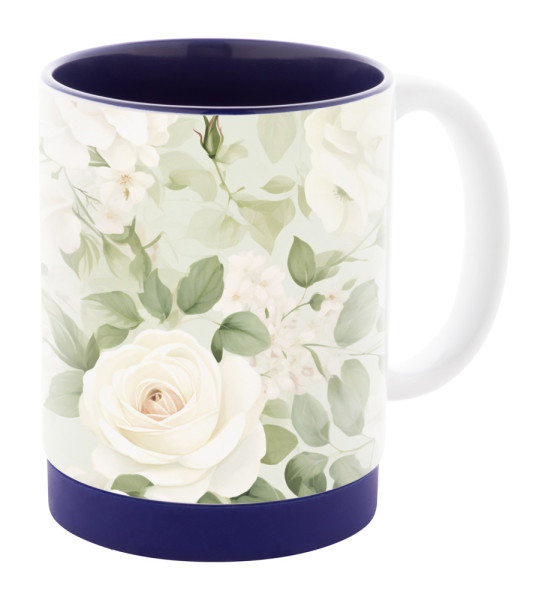 Mug sublimation en céramique avec intérieur coloré et embase en silicone de couleur assortie au fond, 300 ml. Livré dans une boîte en papier blanc.