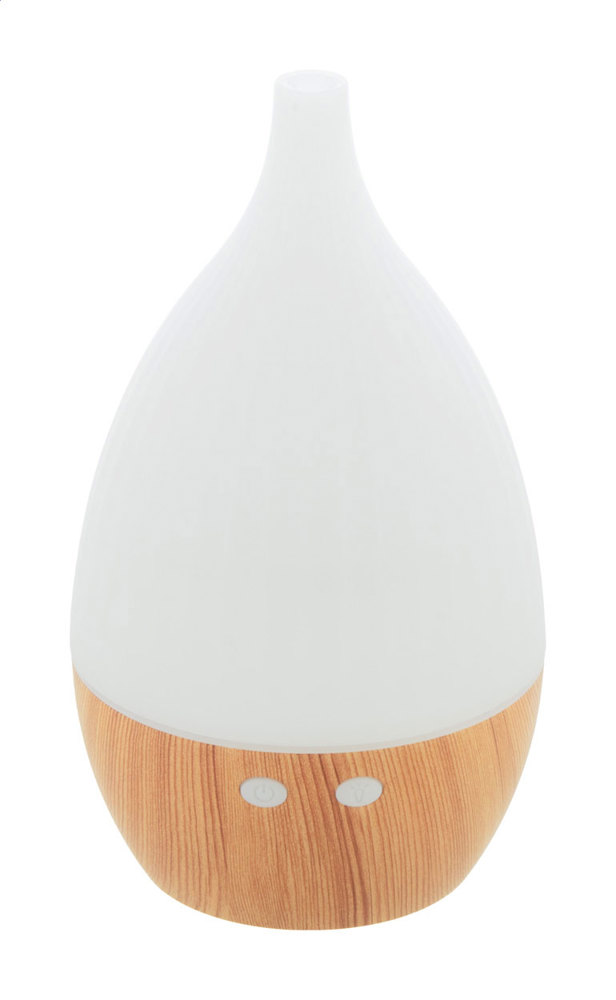 Humidificateur de bureau en plastique PP recyclé avec motif en bois et lumière LED multicolore. Câble de chargeur USB compris. Capacité du réservoir : 120 ml.