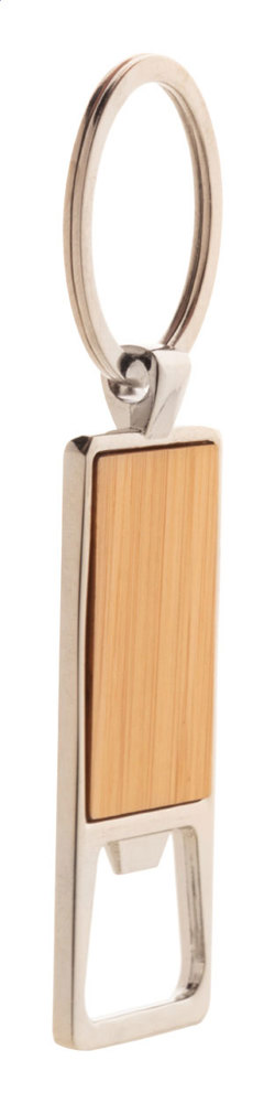 Porte-clés en métal avec insert en bambou et décapsuleur.