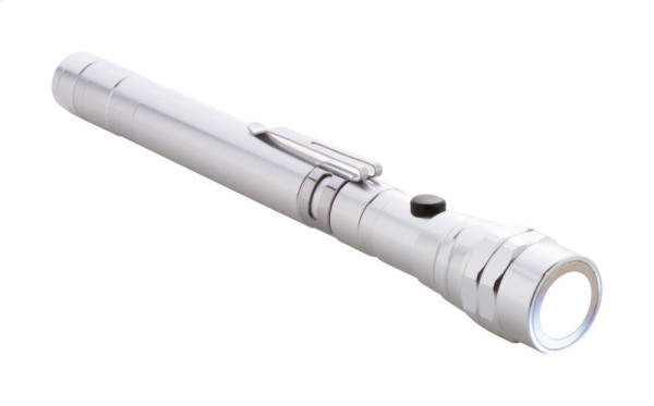 Lampe de poche en aluminium 3 LED avec tête extensible et flexible, aimant sur le dessus et clip latéral en métal. Piles bouton incluses. Max. longueur : 57 cm.