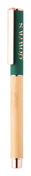 Stylo roller en bambou et aluminium recyclé avec capuchon caoutchouté et détails en doré rose. Avec revêtement spécial pour gravure laser miroir de couleur doré rose. Encre bleue.