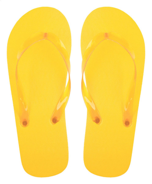 Tongs en PE avec bandes en PVC transparentes de couleur assortie.