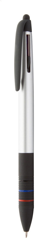 Stylo bille 3 couleurs en plastique avec stylet et embase en gomme. Encres noire, bleue et rouge.