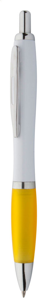 Stylo à bille en plastique avec corps blanc, grip coloré et parties chromées brillantes. Encre bleue.