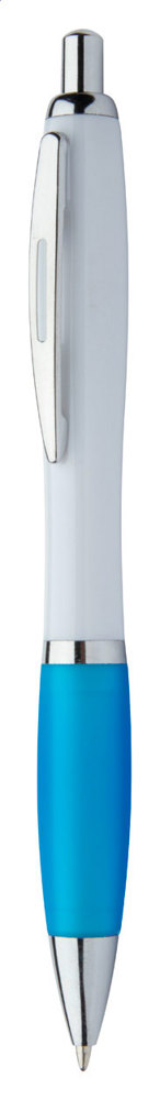 Stylo à bille en plastique avec corps blanc, grip coloré et parties chromées brillantes. Encre bleue.