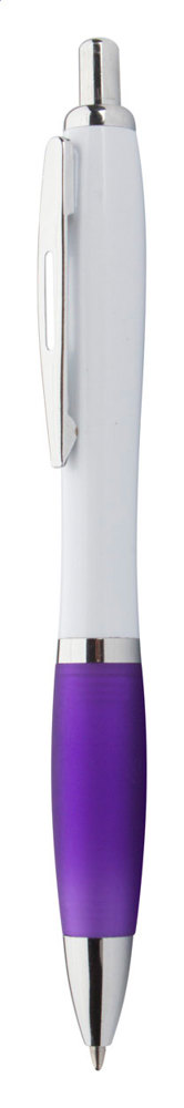 Stylo à bille en plastique avec corps blanc, grip coloré et parties chromées brillantes. Encre bleue.