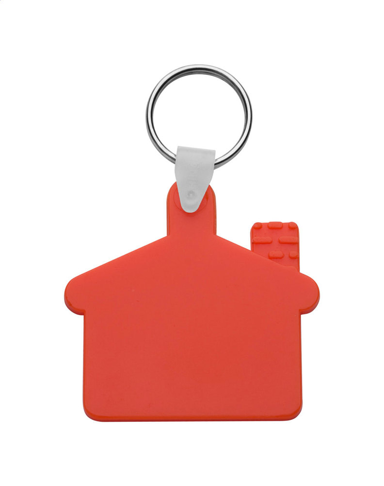 Porte-clés en plastique en forme de maison avec anneau en métal.