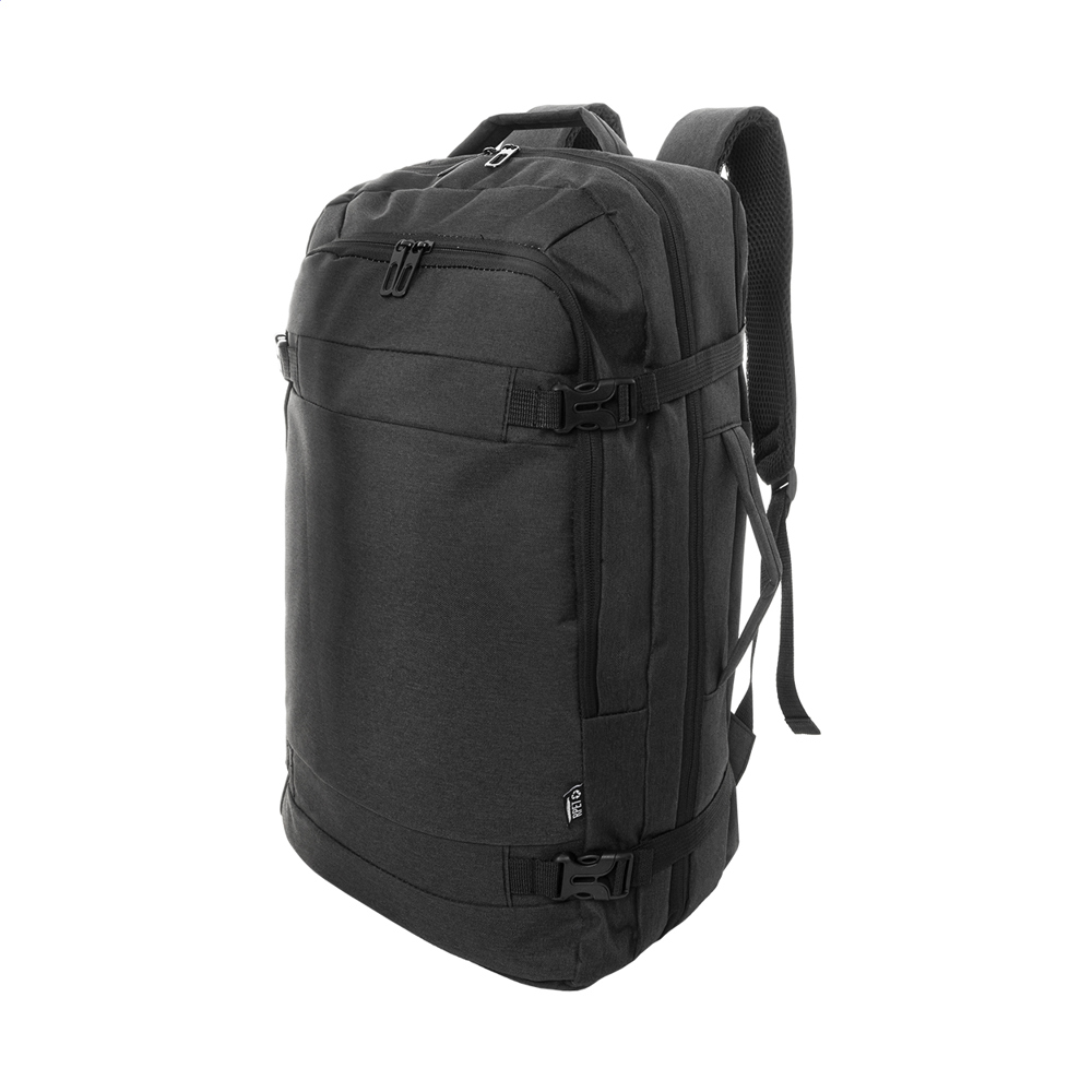 Sac à dos RPET double fonction, porte-documents avec 2 compartiments zippés, poche avant zippée et compartiment rembourré pour ordinateur portable (15"). Avec poche antivol, sangle pour trolley, dos et bretelles rembourrés. Polyester RPET 600D, labélisé RPET.