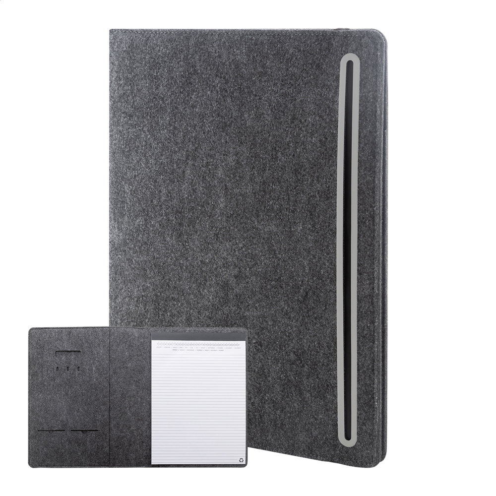 Conférencier en feutrine RPET format A4 avec pochettes avant et plusieurs poches intérieures de rangement. Avec bloc-notes de 20 feuilles lignées en papier recyclé.