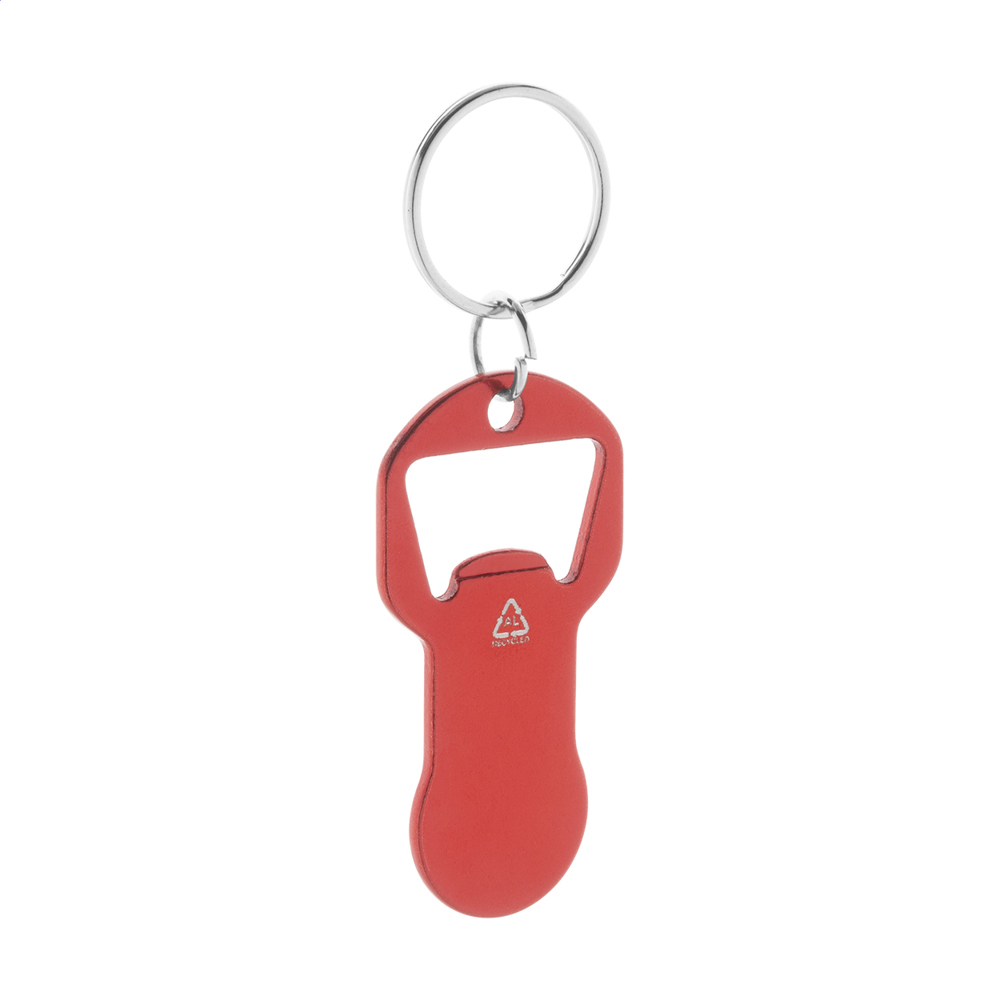 Porte-clés décapsuleur en aluminium recyclé avec jeton de chariot.