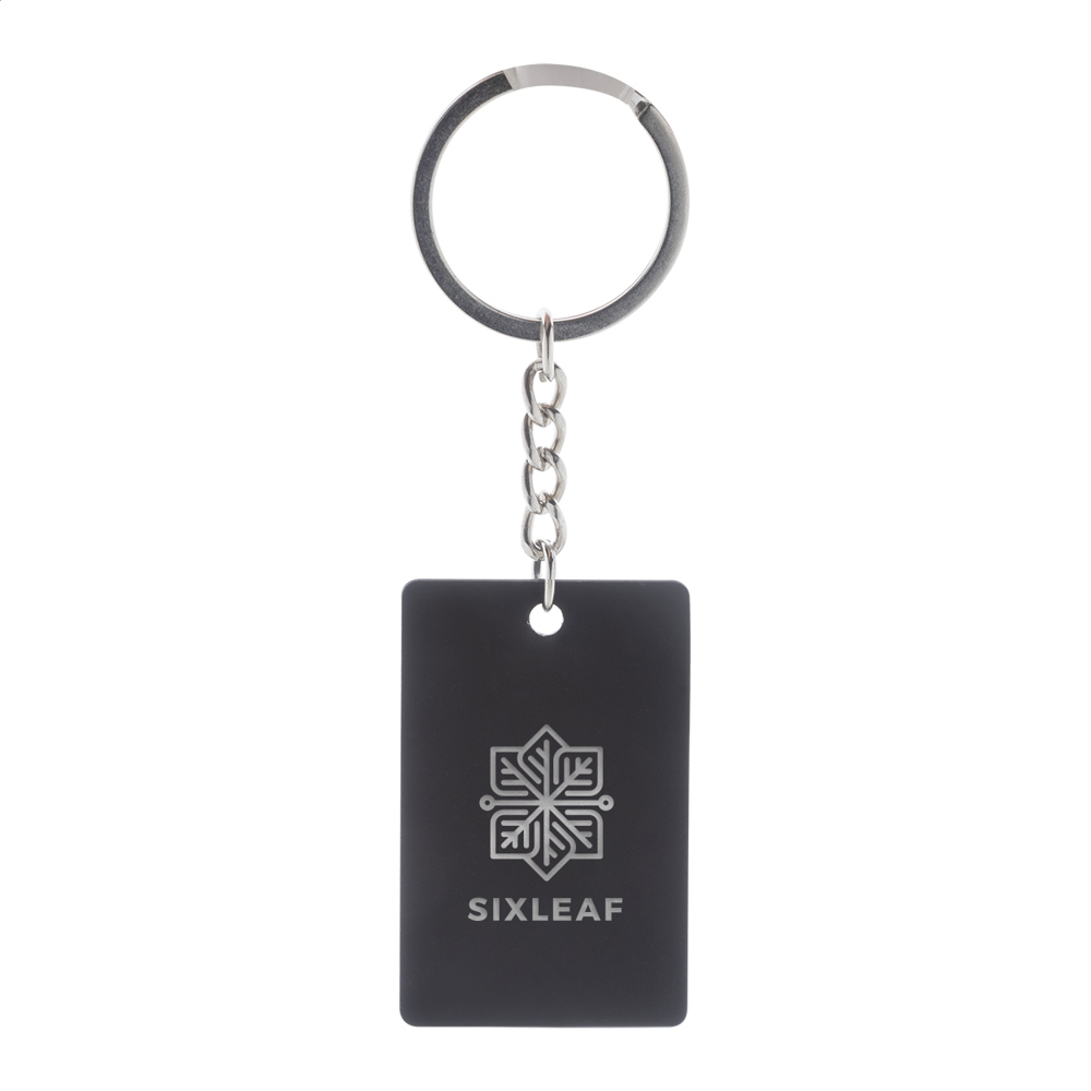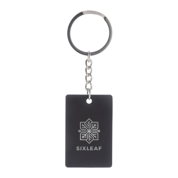 Porte-clés en acier inoxydable recyclé en forme rectangulaire avec finition caoutchoutée. Revêtement spécial pour gravure laser miroir.
