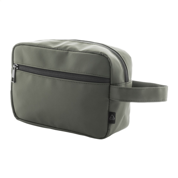 Trousse de toilette en PU recyclé souple avec deux compartiments zippés et poignée. Labélisée PU recyclée.
