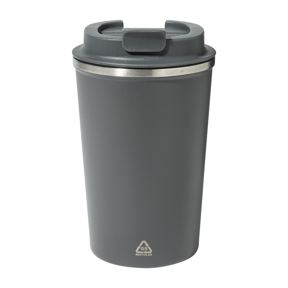 Mug thermos isotherme en acier inoxydable recyclé à double paroi avec bec verseur en PP. 350 ml.