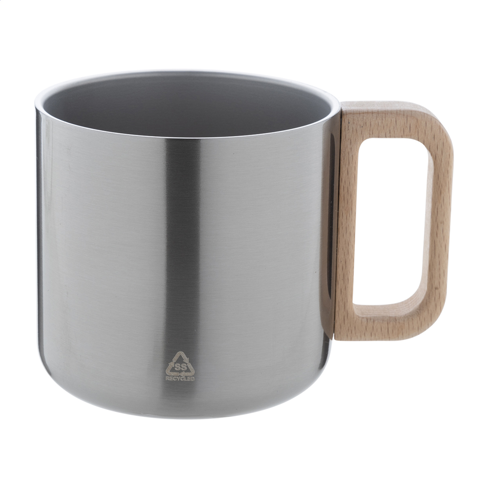 Mug en acier inoxydable recyclé à double paroi avec anse en bois. 350 ml.plus