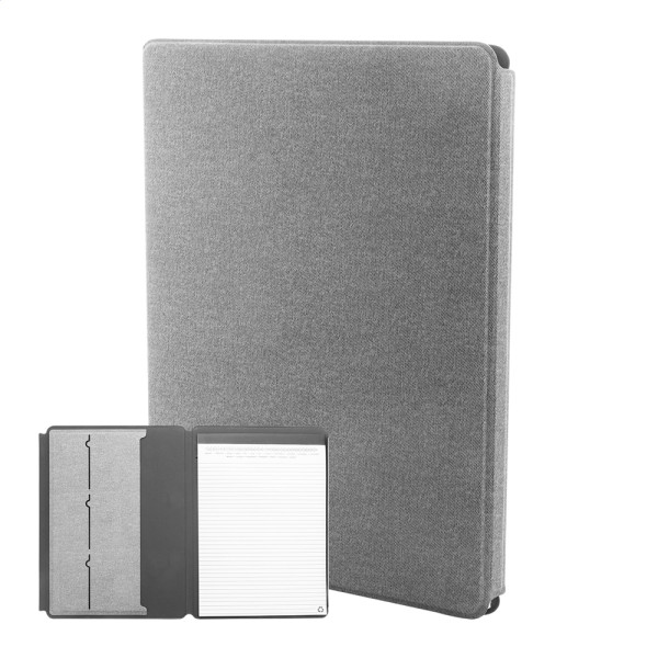 Conférencier en PU recyclé au format A4 avec poches de rangement intérieures et fermeture magnétique. Avec bloc-notes de 20 feuilles lignées en papier recyclé.