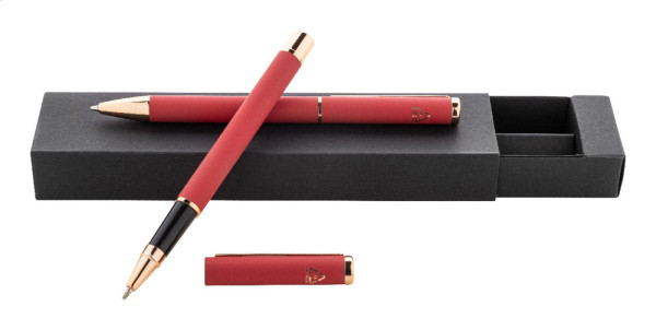 Parure en aluminium recyclé comprenant un stylo à bille et un stylo roller avec finition caoutchoutée et attributs en or rosé. Encre bleue. Avec revêtement spécial pour gravure laser miroir en or rosé. Dans une boîte cadeau en papier noir.