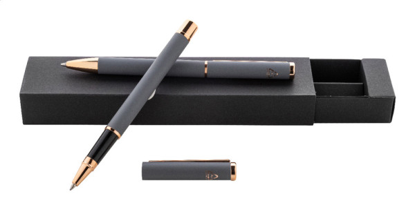 Parure en aluminium recyclé comprenant un stylo à bille et un stylo roller avec finition caoutchoutée et attributs en or rosé. Encre bleue. Avec revêtement spécial pour gravure laser miroir en or rosé. Dans une boîte cadeau en papier noir.
