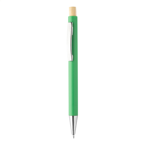 Stylo à bille en plastique ABS recyclé avec bouton en bambou et clip en métal. Encre bleue.
