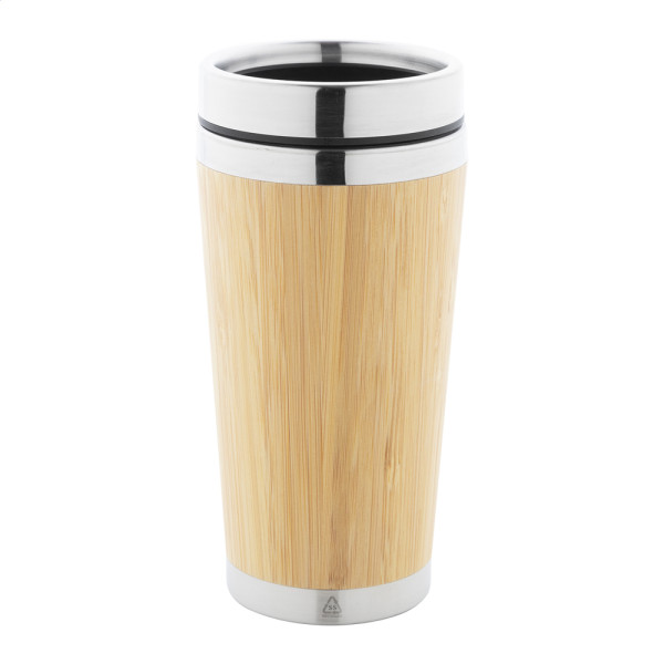 Mug thermos isotherme en acier inoxydable recyclé à double paroi recouvert de bambou avec couvercle en PP, 500 ml.