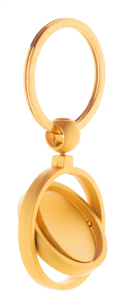 Porte-clés en métal finition dorée avec partie intérieure rotative. Livré dans une boîte en papier kraft.