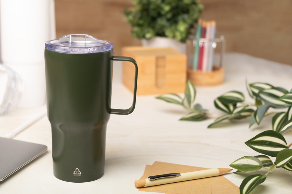 Mug isotherme à double paroi en acier inoxydable recyclé, isolé, avec couvercle en plastique PS. 600 ml.