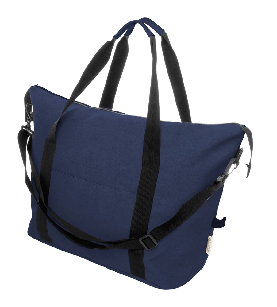 Sac de voyage/sport en toile recyclée avec compartiment principal zippé, poche avant, bandoulière réglable et poche arrière zippée qui sert également de sangle de trolley. 70% coton recyclé et 30% polyester RPET. Labélisé coton recyclé.