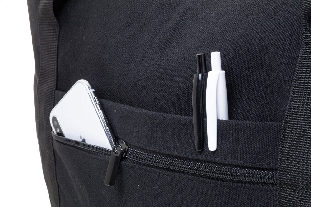 Sac de voyage/sport en toile recyclée avec compartiment principal zippé, poche avant, bandoulière réglable et poche arrière zippée qui sert également de sangle de trolley. 70% coton recyclé et 30% polyester RPET. Labélisé coton recyclé.