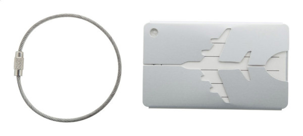Étiquette à bagage en aluminium avec motif avion et attache métallique.