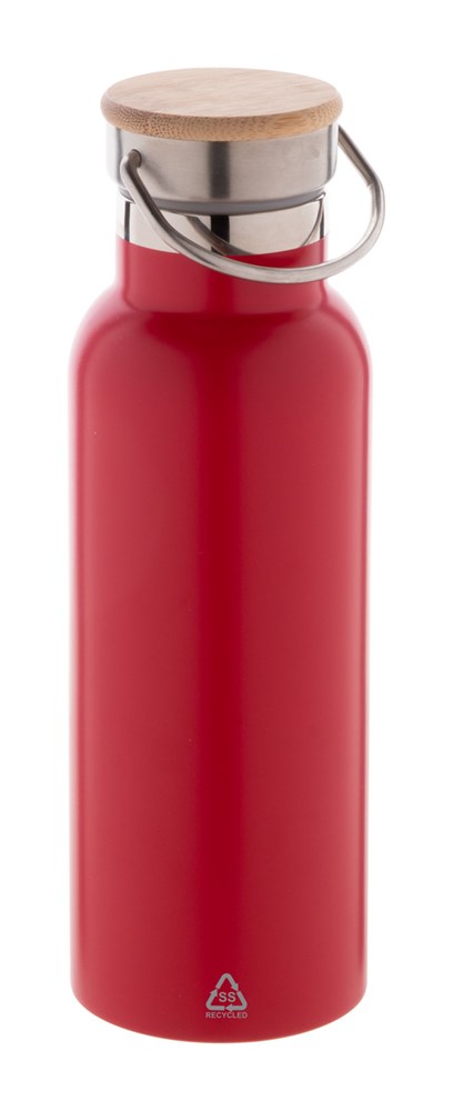 Bouteille isotherme à double paroi en acier inoxydable recyclé avec couvercle en bambou et anses. 500 ml.