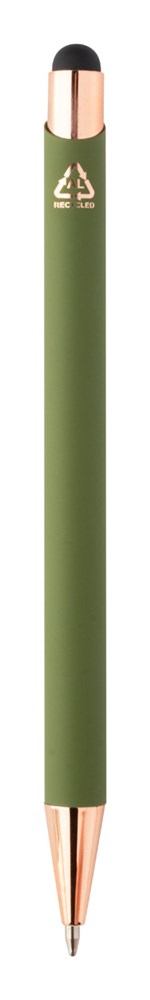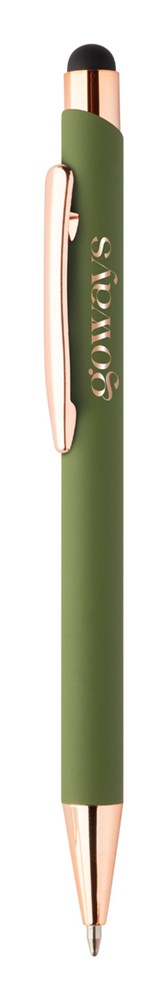 Stylo à bille et stylo tactile en aluminium recyclé avec finition caoutchoutée et détails en rose doré. Spécial pour gravure laser miroir de couleur rose doré. Encre bleue.