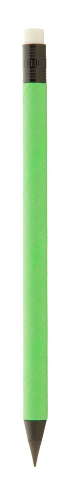 Stylo sans encre longue durée en papier recyclé avec détails noirs et gomme. Avec pointe en alliage métallique qui oxyde le papier. Ce stylo écrit de la même manière qu’un crayon et est également effaçable.