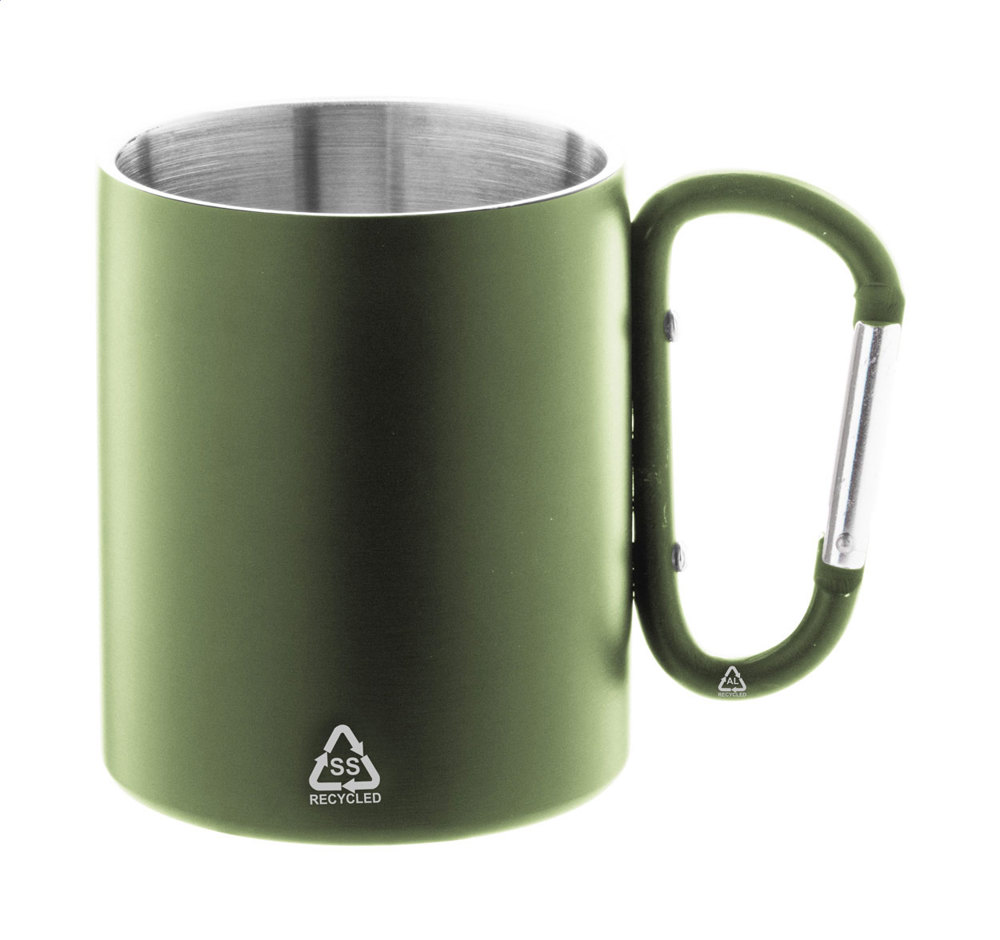 Mug thermos à double paroi en acier inoxydable recyclé avec poignée mousqueton en aluminium recyclé de couleur assortie. 300 ml. Dans une boîte en papier kraft.