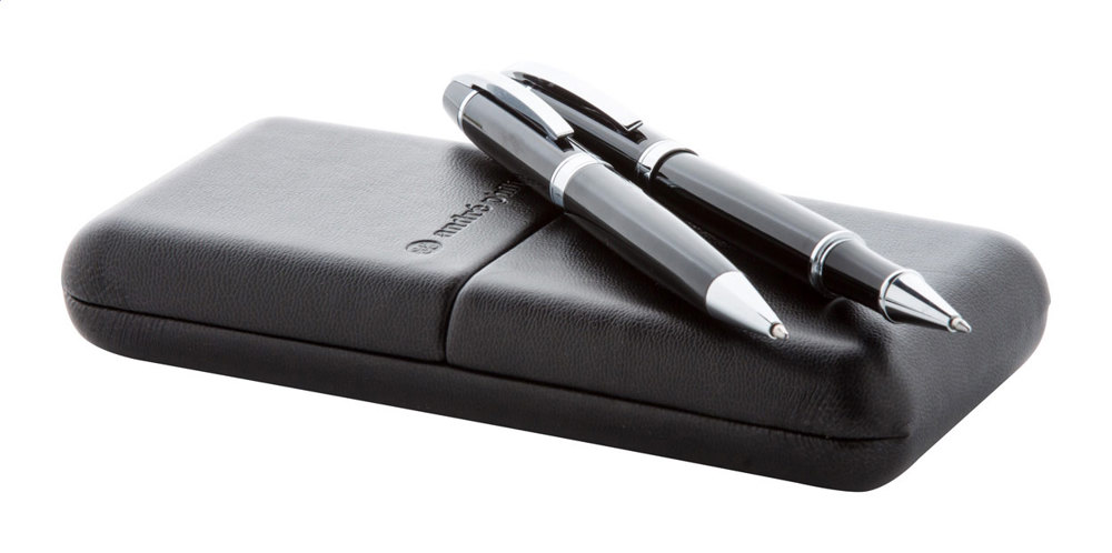 Parure de stylos à bille en métal avec parties chromées brillantes. Livrée dans une boîte cadeau en PU. Encre bleue. Marque André Philippe.