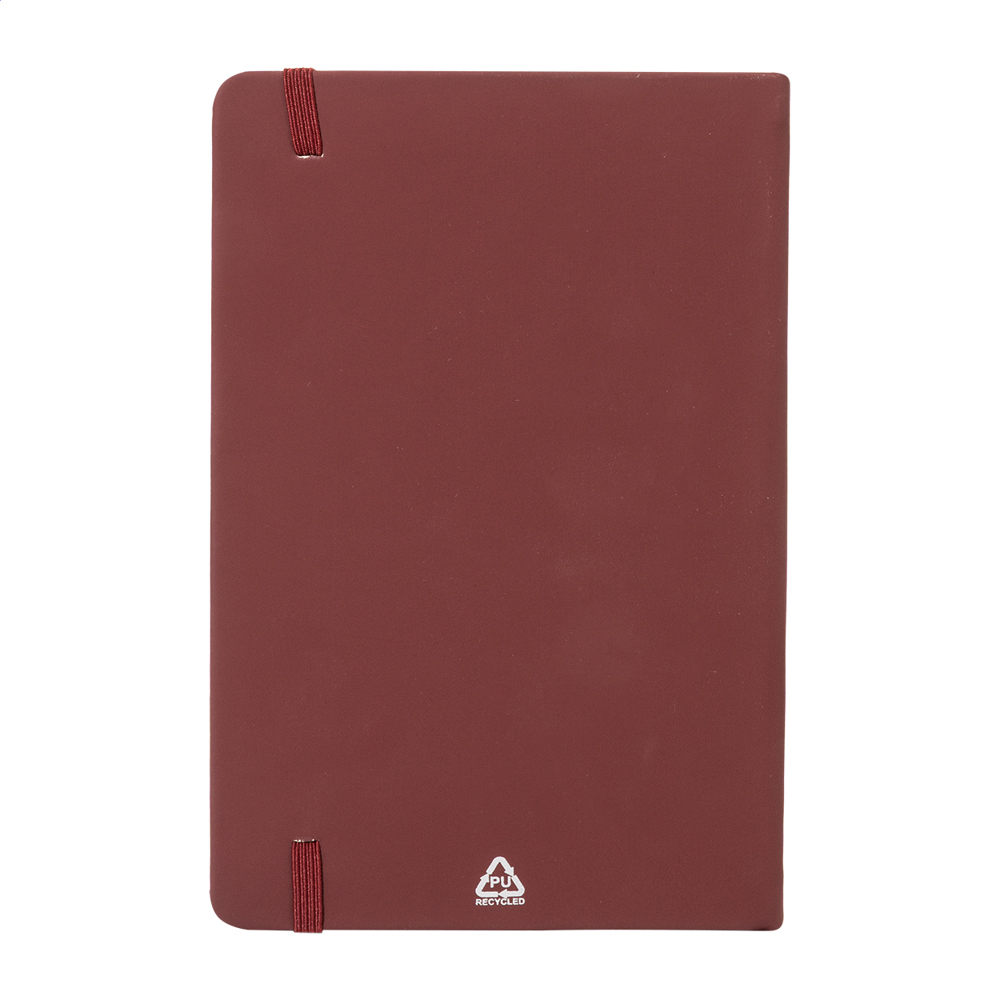 Carnet recouvert en similicuir recyclé avec 100 feuilles vierges en papier recyclé. Avec marque-page et élastique de couleur assortie. Format A5.