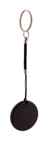 Dispositif de recherche de clés sans fil avec obturateur de caméra, dans un boîtier plastique de forme ronde. Avec cordelette et porte-clés en métal. Avec pile bouton. Fonctionne avec une application gratuite iOS / Android.