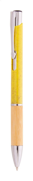 Stylo à bille en plastique écologique en paille de blé avec grip en bambou et attributs en métal. Encre bleue.