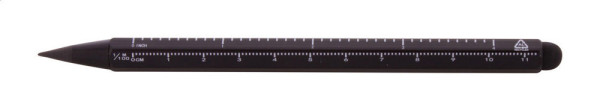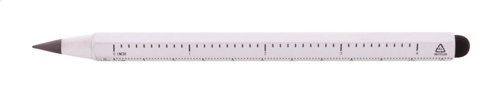 Stylo sans encre, longue durée en aluminium recyclé avec stylet tactile et pointe en alliage métallique, qui oxyde le papier. Avec forme hexagonale comprenant des règles de 11 cm et 4 pouces. Ce stylo écrit de la même manière qu'un crayon, et il est également effaçable.