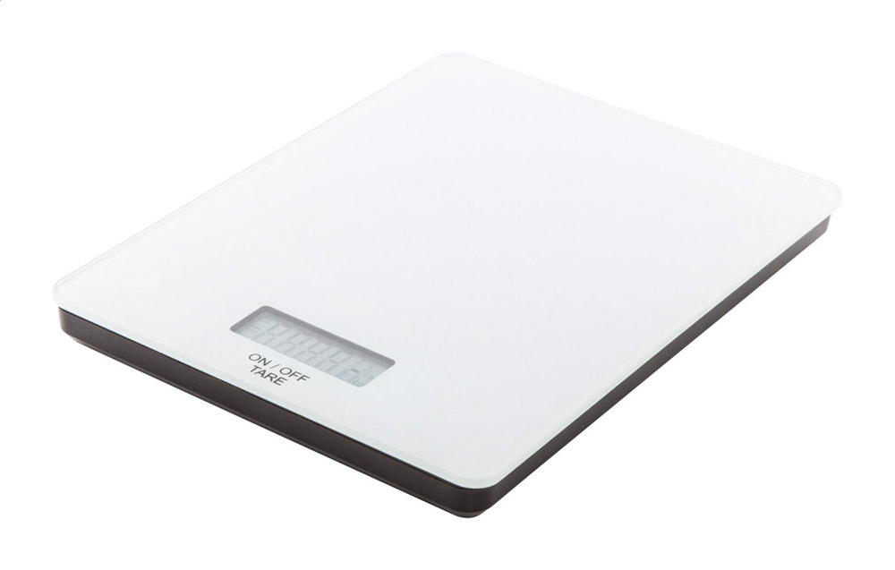 Balance de cuisine numérique avec plateau en verre. Capacité: 5 kg, graduation: 1 gr., unités de mesure: g/oz. Fonctionne avec 2 piles AAA. Livrée sans piles.
