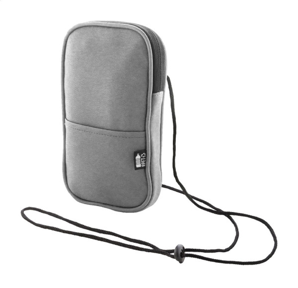 Sac pour téléphone portable transversal en RPET imperméable avec compartiment principal zippé, poche frontale et cordon réglable. Polyester 600D RPET enduit de PU, avec étiquette RPET distinctive.