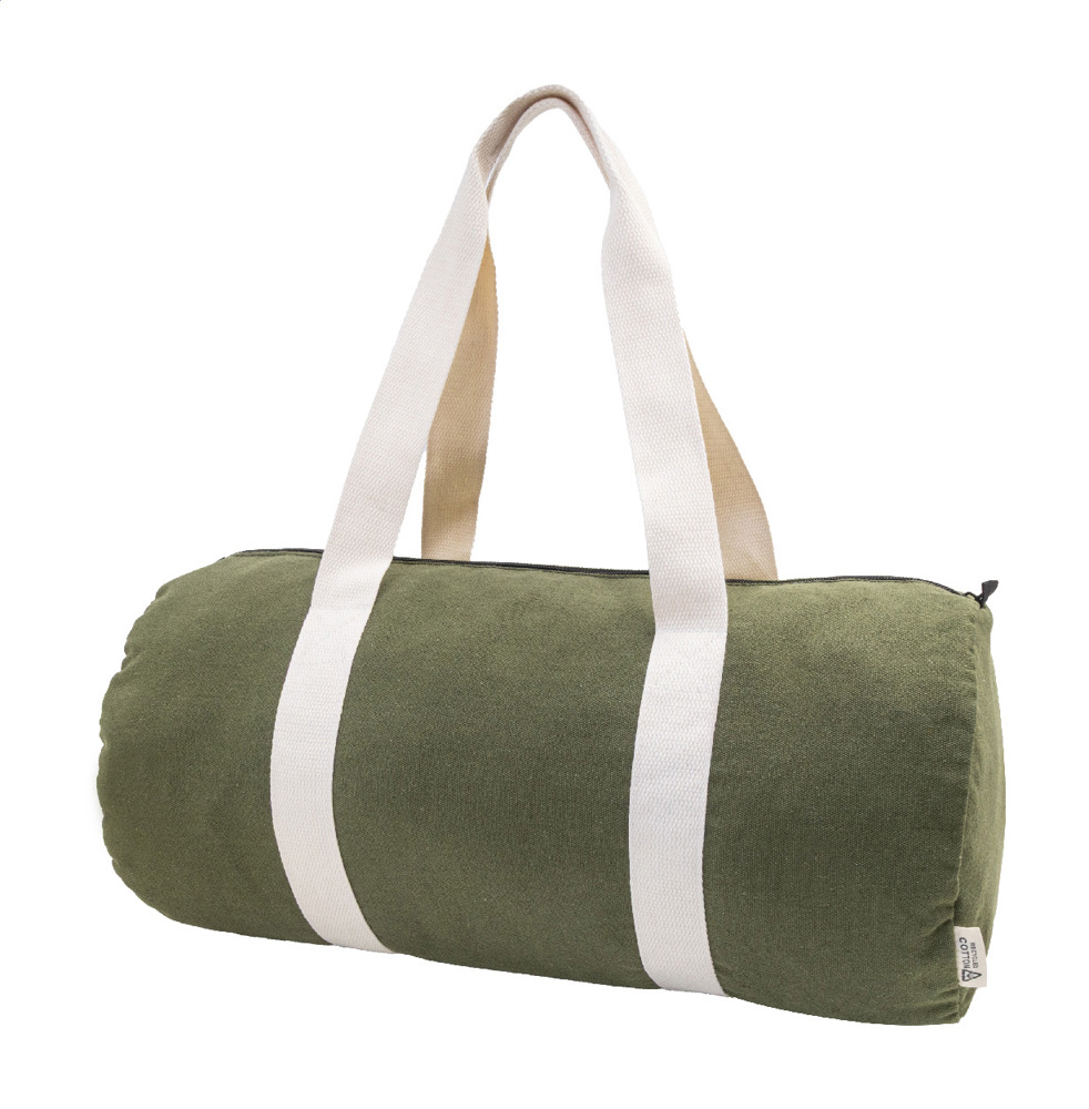 Sac de sport en canvas recyclé avec compartiment principal zippé, poche intérieure zippée et anses longues. 70% coton recyclé et 30% polyester recyclé. Avec étiquette distinctive en coton recyclé.