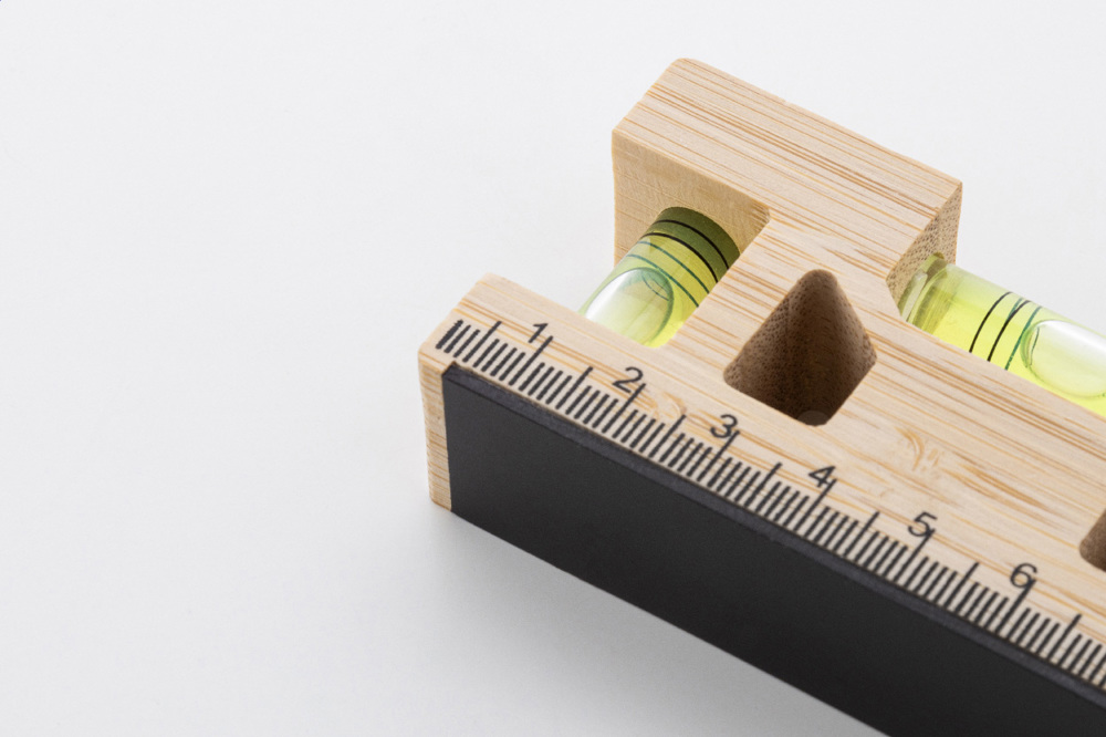 Porte-clés multifonctionnel en bambou avec anneau métallique, règle, aimant et deux niveaux à bulle.