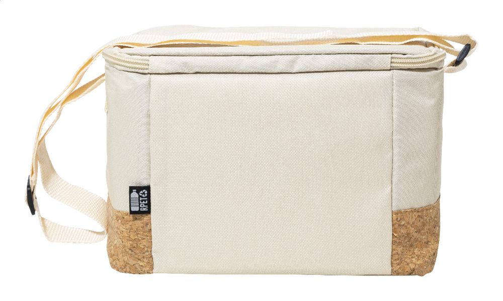 Sac isotherme zippé en polyester 600D RPET avec base en liège naturel, rembourrage en PEVA et bandoulière réglable. Avec étiquette RPET distinctive.