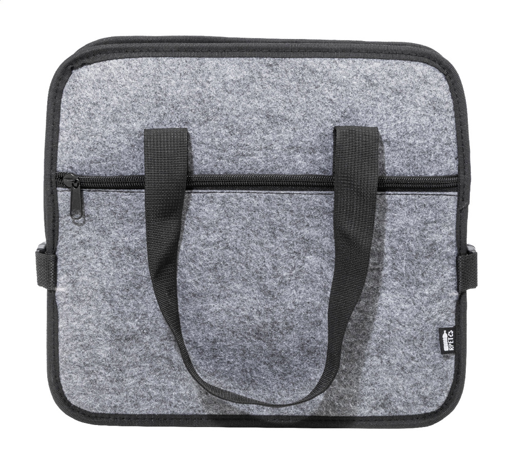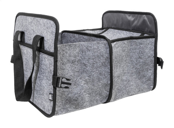 Organiseur de coffre de voiture pliable en feutrine RPET avec poche frontale zippée, longues anses et boucles latérales pour un rangement pratique. Comprend un compartiment de rangement ouvert et un compartiment réfrigéré zippé avec rembourrage en aluminium. Avec étiquette RPET distinctive.