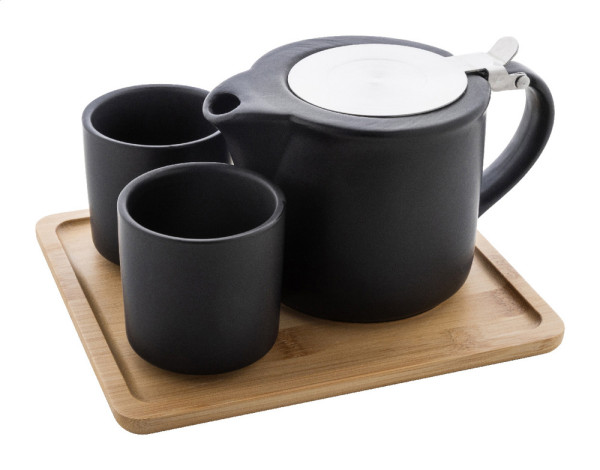 Service à thé en céramique de haute qualité avec finition mate et plateau de service en bambou. Comprend une théière (500 ml) avec couvercle en acier inoxydable et passoire à thé, et deux tasses (150 ml). Dans une boîte en papier kraft.