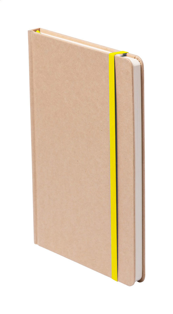 Carnet recouvert de carton recyclé avec 100 feuilles non lignées, marque-page de couleur et fermeture élastique en caoutchouc.