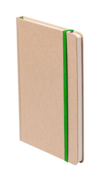 Carnet recouvert de carton recyclé avec 100 feuilles non lignées, marque-page de couleur et fermeture élastique en caoutchouc.
