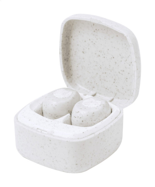 Plastique écologique en paille de blé, écouteurs stéréo sans fil (TWS) avec fonction d'appel mains libres dans un étui chargeur. Câble de chargement USB inclus.