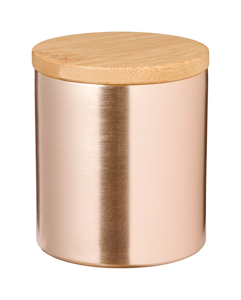 Bougie parfumée à la vanille dans un support en aluminium avec couvercle en bambou.