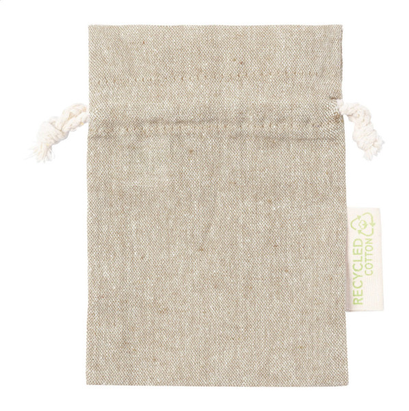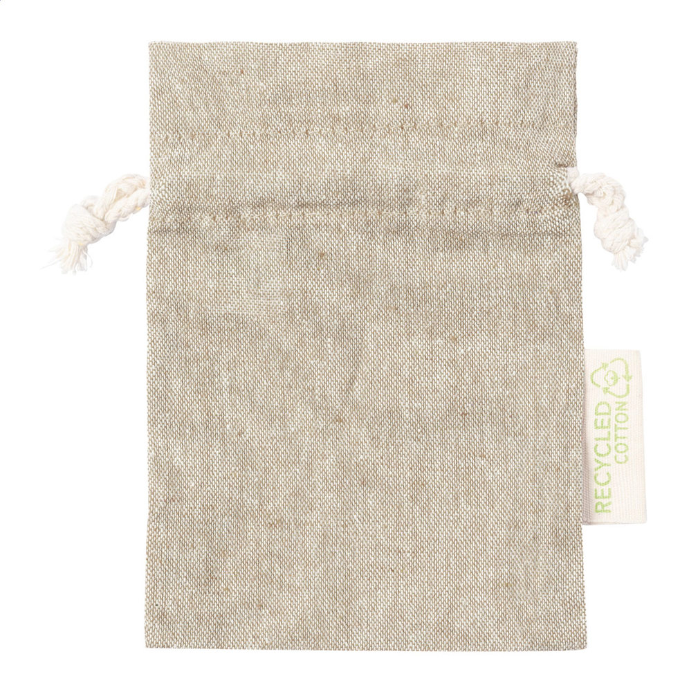 Sac cadeau en coton recyclé avec fermeture à cordon. Avec étiquette Coton recyclé. 100% coton recyclé, 120 g/m².